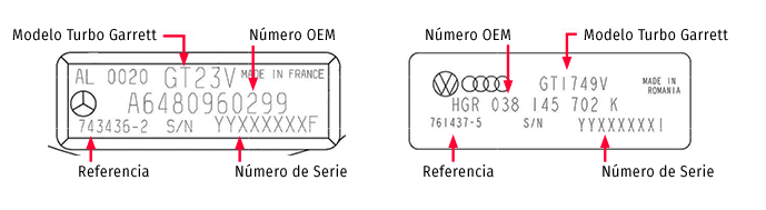 En esta sección se explican las etiquetas de los principales fabricantes para poder obtener la Referencia del turbocompresor, que es la forma de identificar a un turbocompresor de forma única. La Referencia también puede aparecer como Part Number o P/N.